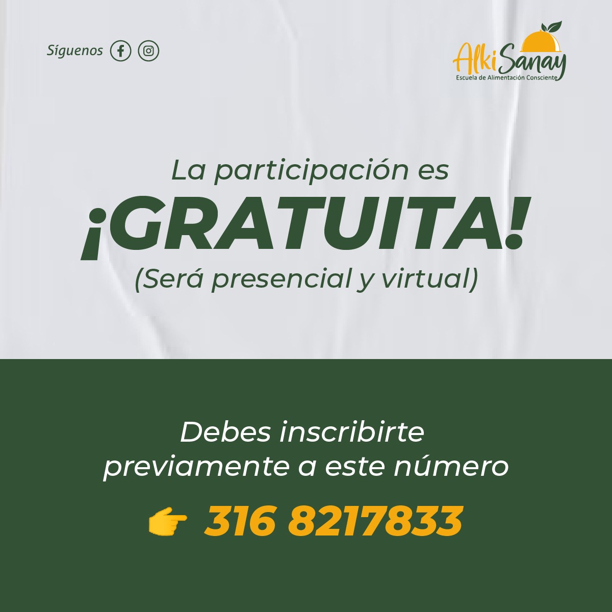 El programa contempla un ciclo de 3 talleres que se dictarán de manera presencial para aquellos cuidadores/as que puedan acudir a la Sede de la ESCUELA DE ALIMENTACIÓN CONSCIENTE ALKISANAY ubicada en el barrio Santa Isabel de la ciudad de Cali y para aquellos cuidadores/as que no pueden asistir de manera presencial, se facilitará la plataforma Zoom y así participar de manera virtual.